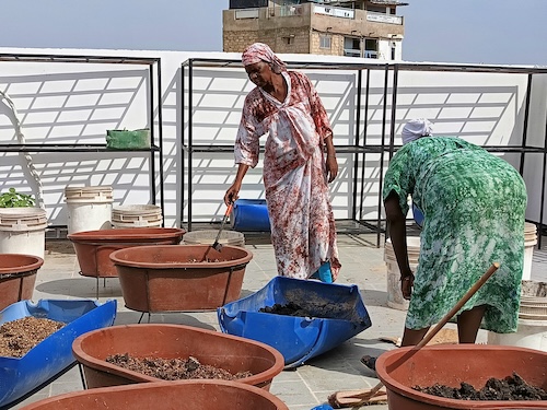 1 – les femmes sont en train d’installer de nouveaux bacs de culture plus solides et plus profonds que les tables de bois ;