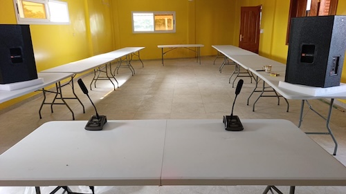 1 – la grande salle équipée : au fond le mur pour les projections, devant la sonorisation ;