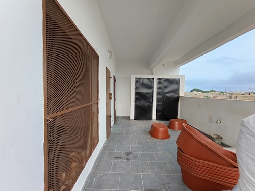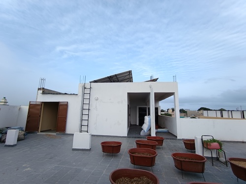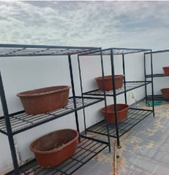 5 et 6 – le toit est carrelé prêt à recevoir les bacs de cultures. Le serrurier a réinstallé les étagères .tout autour du toit pour accueillir des cultures.